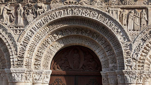 La façade actuelle a été réalisée dans les années 1115/1130, suite à l'agrandissement de la nef vers l'ouest. Elle présente un ensemble sculpté remarquable, qui témoigne de l'essor de la sculpture au 12e siècle. Le programme sculpté, exceptionnel par son abondance et sa qualité, est une affirmation de la foi chrétienne et fait la part belle aux scènes figurées. La plus célèbre est la frise du rez-de-chaussée qui illustre l'histoire de l'Incarnation depuis Adam et Ève jusqu'à l'Enfance du Christ.