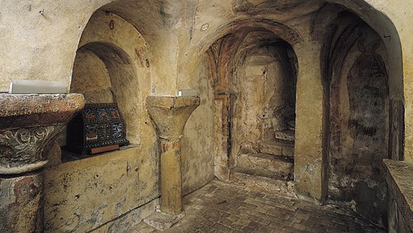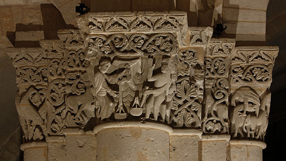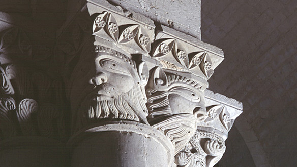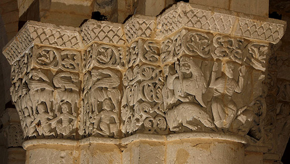 Attestée dès le 6e siècle, l’église Saint-Eutrope à Saintes, en Charente-Maritime, est construite autour du tombeau de saint Eutrope. Ce saint est, selon la tradition, le premier évêque de Saintes, et l'évangélisateur de la Saintonge. À la fin du 11e siècle, les moines de l’abbaye de Cluny reconstruisent cette église dans de grandes dimensions et selon un plan atypique : une longue nef, un transept et un chœur profond qui s'élève sur une vaste crypte qui accueille, en 1096, les reliques du saint. Cette église romane est largement remaniée et mutilée au cours des siècles suivants. Dans les parties qui subsistent aujourd'hui (la crypte, le chœur et le transept), de remarquables chapiteaux sculptés témoignent de l’évolution de la sculpture romane entre la fin du 11e et le début du 12e siècle.