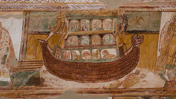 C'est dans la nef, haute de plus de 17 mètres, que se trouve le programme le plus développé. Il se déploie sur toute la voûte, soit 460 m2. À l’exception de rares scènes de genre et d'éléments décoratifs (arbres), il illustre les histoires les plus importantes de la Genèse et de l'Exode, premiers livres de la Bible : Adam et Ève, Caïn et Abel, Noé, Abraham, Joseph, Moïse...