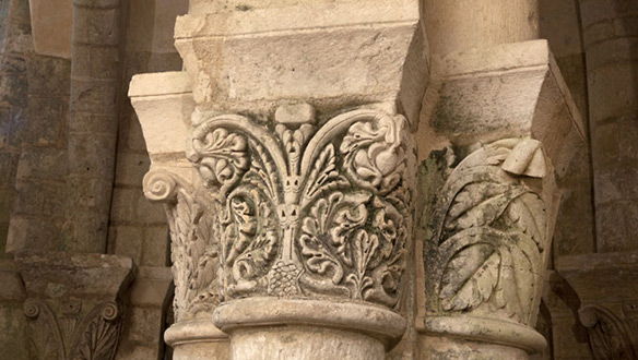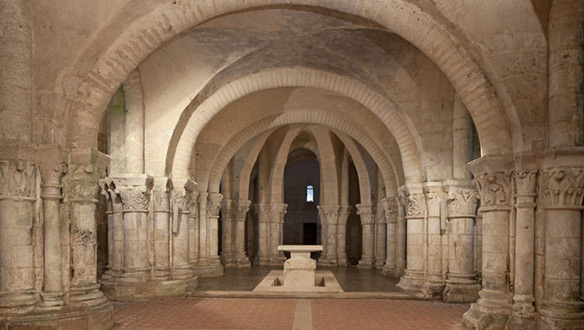 Les chapiteaux de la crypte et du chœur ont été réalisés à la fin du 11e siècle. Ceux de la crypte, au nombre de 53, sont ornés de compositions végétales. Les artistes romans ont sculpté des palmettes, des acanthes, des rinceaux... Les feuillages recouvrent fréquemment les angles et envahissent la totalité de la corbeille avec symétrie. Ces motifs sont issus du répertoire décoratif des monuments antiques et font d’ailleurs penser, pour certains, aux sculptures des édifices romains qui ont été conservées à Saintes. L'ancien chœur présente des chapiteaux similaires à ceux de la crypte, hormis trois chapiteaux, ornés de sirènes, de lions et de griffons, qui affichent des parentés de style avec la sculpture du Poitou.